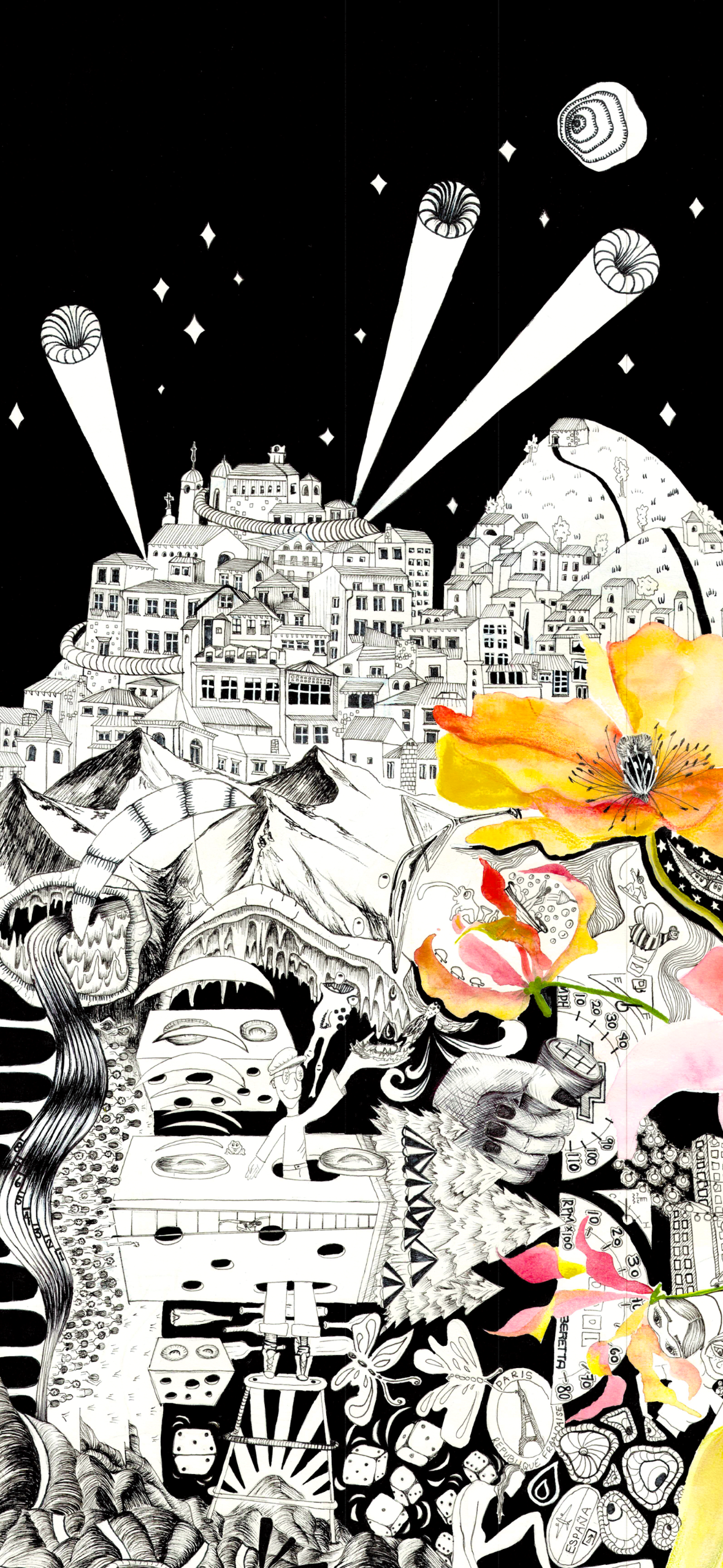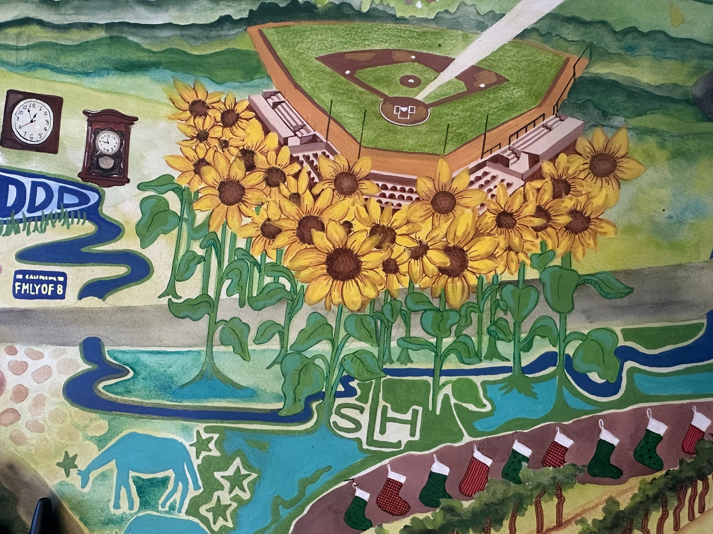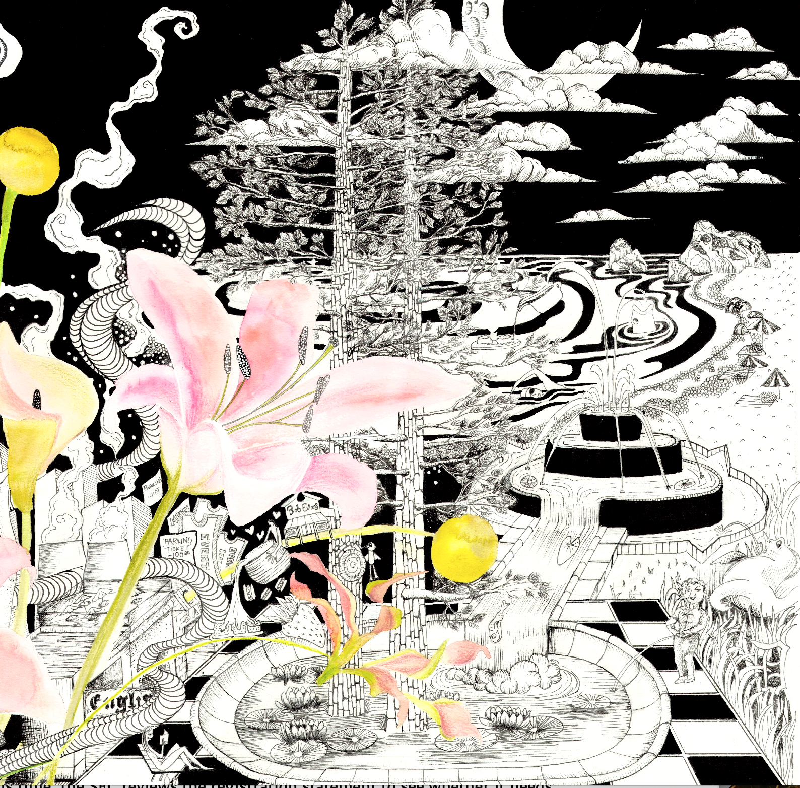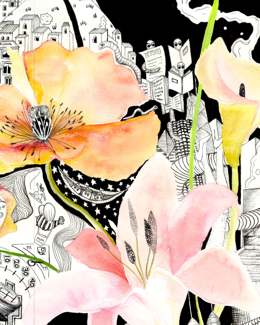 This custom piece gets it name from the couple who commissioned it. Kit’s gift to Kat was for her to have her story told in doodles. Kat’s gift to me was to let me have complete creative freedom with the piece and here’s how it turned out! I worked her life details into the pen & ink and contrasted the sharp lines with soft watercolor lilies to create one of my all time favorite creations. This piece can be seen hanging in Kit & Kats apartment in downtown Chicago.