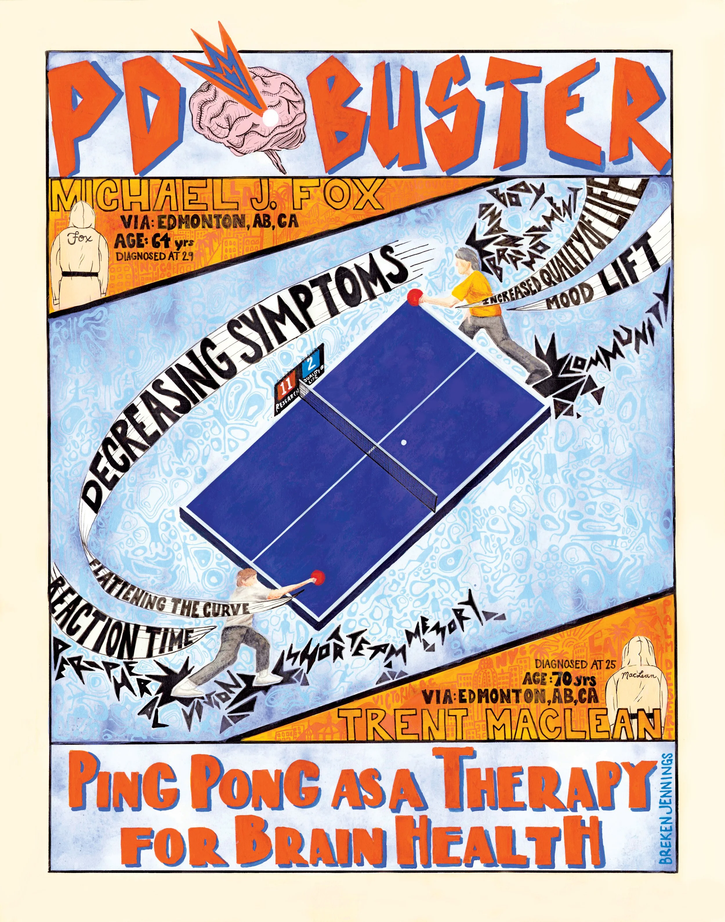 This custom visual biography was designed specifically for a monumental matchup. The goal of this project is to bring global awareness to Ping Pong Therapy as a critical tool for brain health, showcasing the significant motor and cognitive benefits for those living with Parkinson’s Disease (PD).
